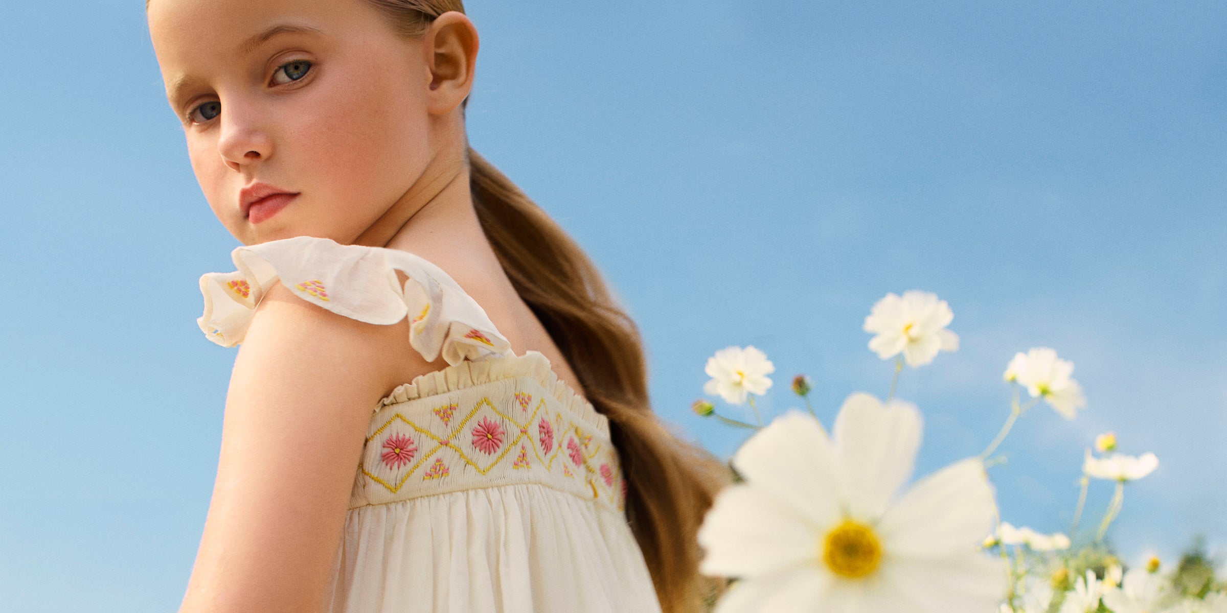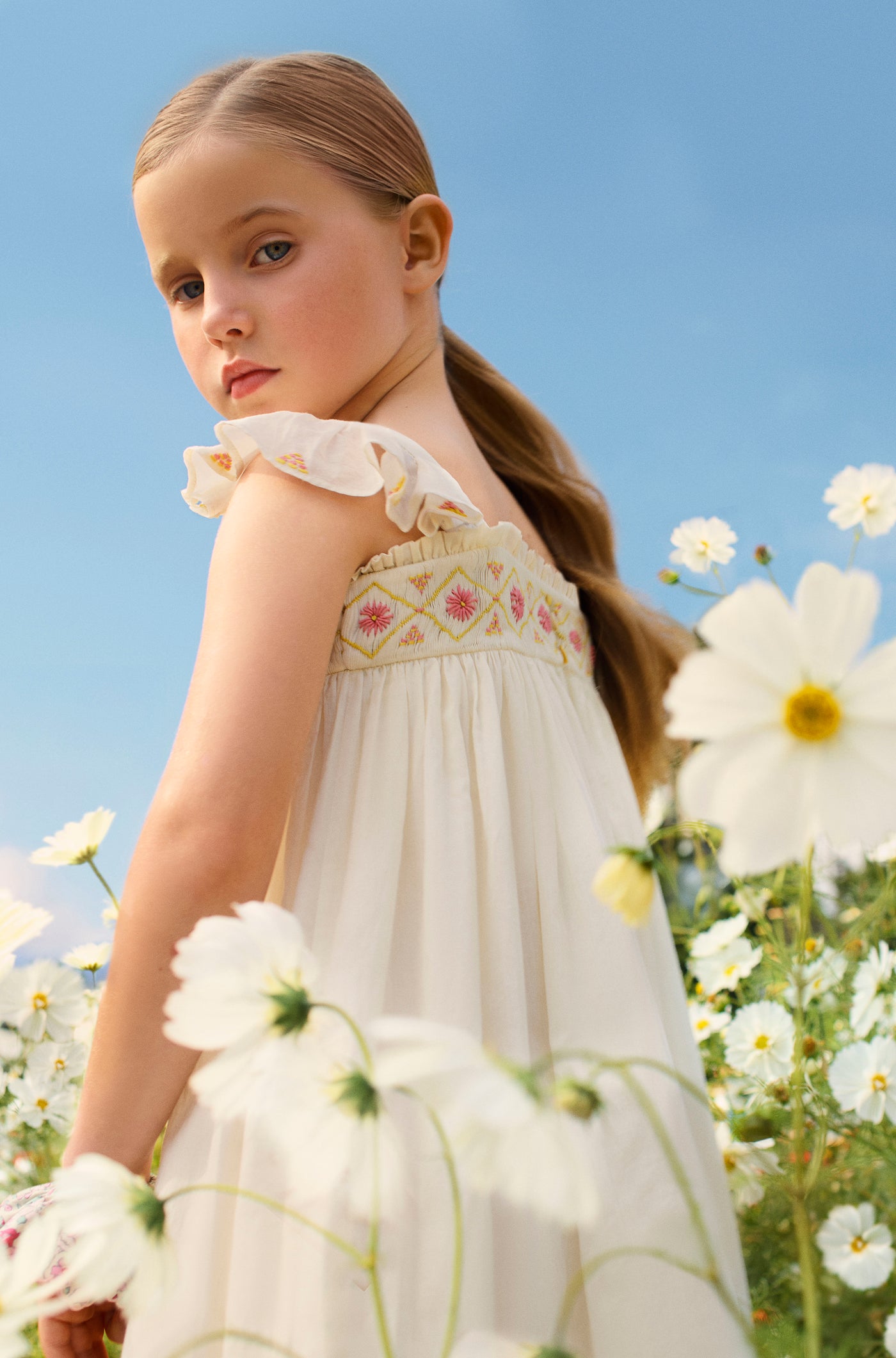 Seit 1975, dem Jahr, in dem Bonpoint gegründet wurde, ist das Blusenkleid eines der ikonischen Stücke in Bonpoints Garderobe. Die Herstellungstechnik der Blusen, die bis zu 30 Stunden Stickarbeit erfordern kann, ist das Markenzeichen des außergewöhnlichen Know-hows des Duchesse-Kleids. Sein leichtes, feines Gewebe und die zarte Raffung unter der Brust verleihen diesem zeitlosen Kleid Charme. Das Duchesse-Kleid wird jede Saison neu interpretiert.