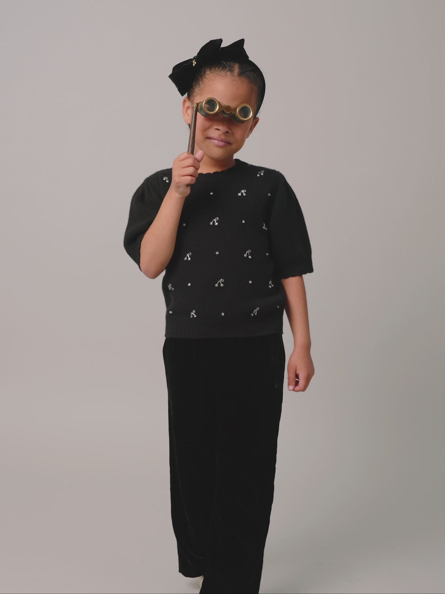 Made from a wool and cashmere blend, the Justine sweater for girls is crafted in a soft knit in a timeless hue. The entire front is decorated with contrasting embroidered cherries in rhinestones and pearls. Graceful scalloping features around the sleeve and neckline edges, while the short sleeves are puffed for a subtle volume effect.