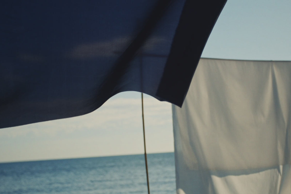 On the beach, our dynamic Bonpoint tribe ventures into a world where indigo drapes ripple like a living horizon. In this deep palette, laughter travels across a serene landscape where tie-dye and hand-drawn motifs unfold, revealing a modern and refined Spring wardrobe.