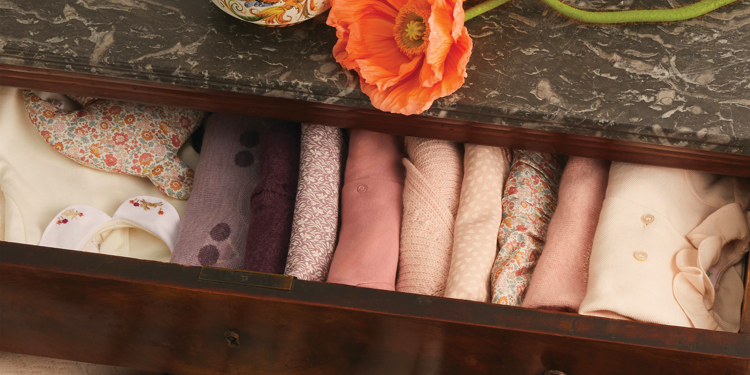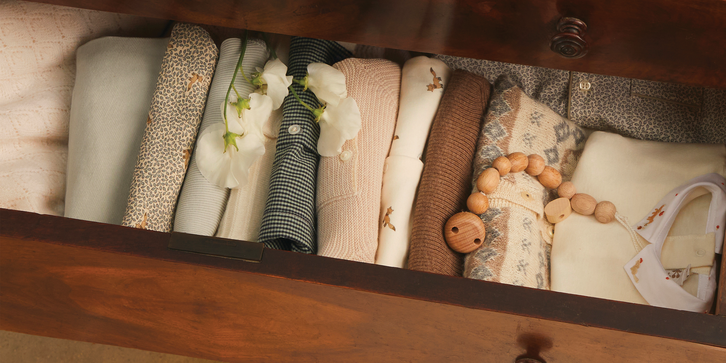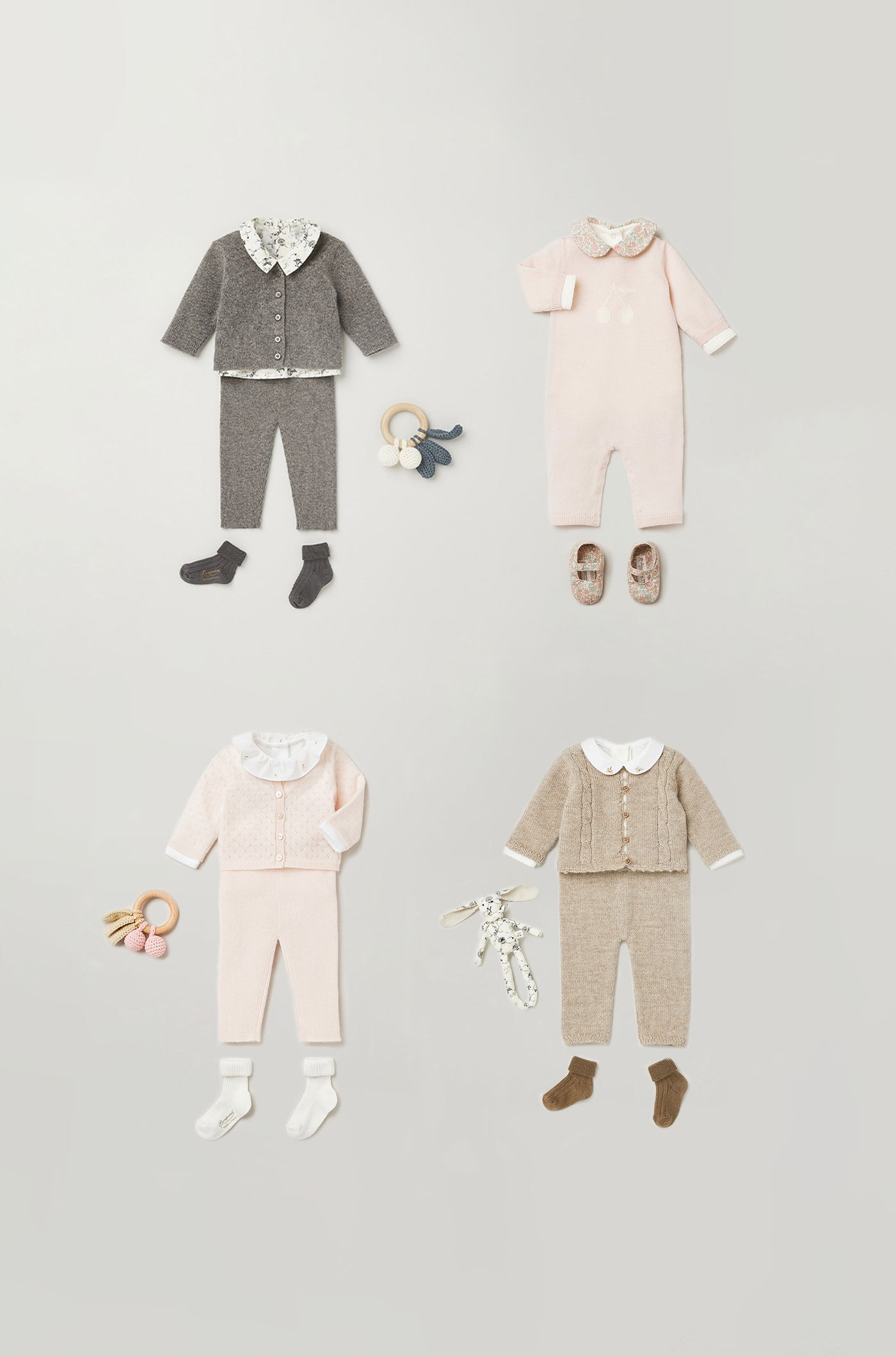Wool and cotton outfits in seasonal tones evoke infinite tenderness. Sleep sacks in bucolic prints accompany baby's sweetest dreams, while floral swaddling blankets or cuddly toys provide comforting softness.