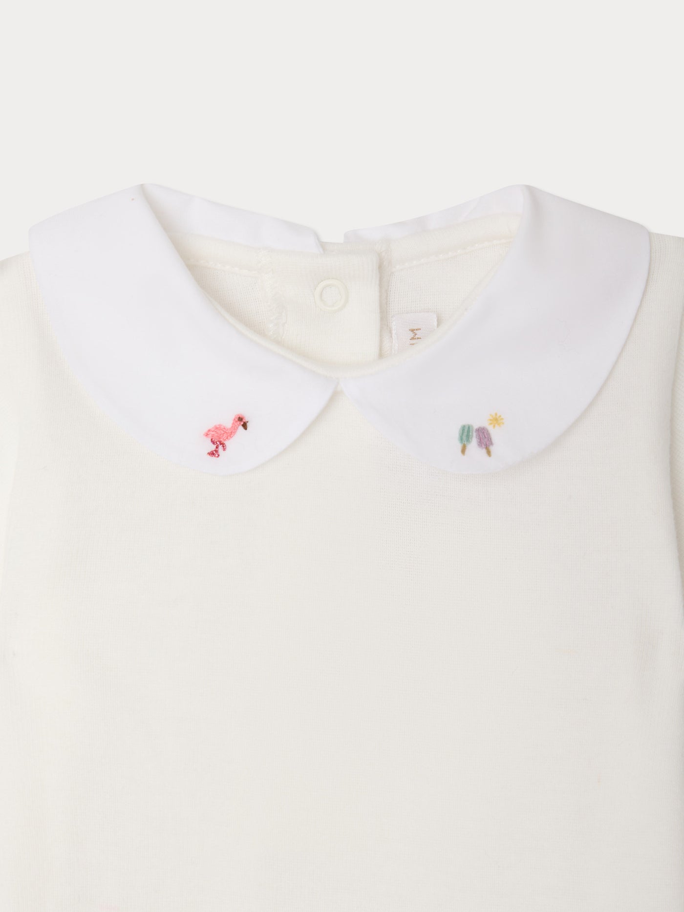Ce pyjama en coton biologique Lintina ajoute une touche d'élégance à la tenue de nuit de bébé. Il se démarque par son grand col brodé à la main.