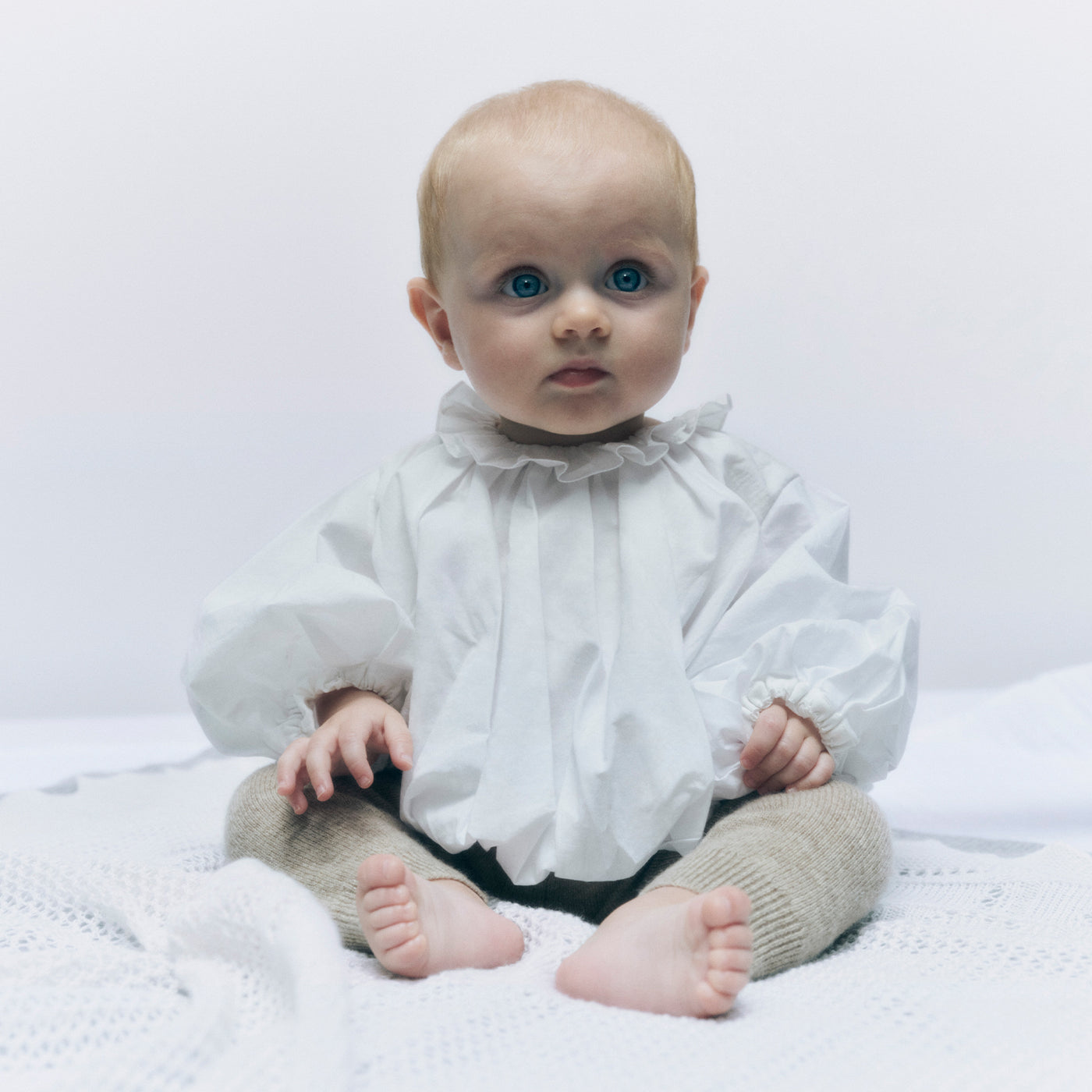 La collezione comprende una tutina a maniche lunghe firmata BONPOINT con colletto a contrasto che mostra un bizzarro motivo naturale, un voluminoso top in cotone bianco leggero con un accattivante colletto arricciato e un morbido pantalone in velluto a coste.