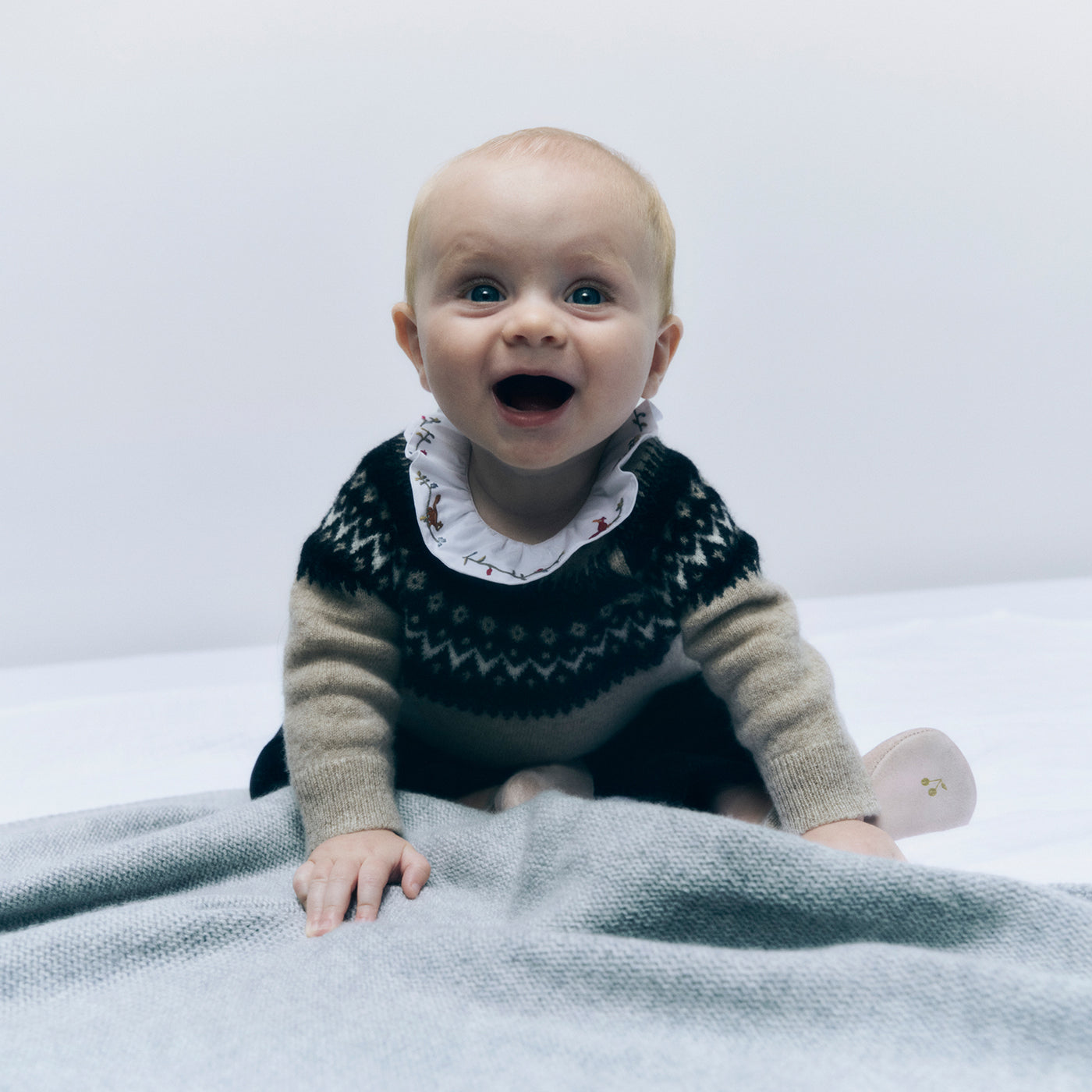 La collezione comprende undici pezzi unici, di età compresa tra 3 mesi e 10 anni. All'interno della collezione c'è un maglione che mette in risalto il caratteristico motivo Fair Isle firmato KHAITE con chiusura a bottoni laterali, leggings elasticizzati in vita con dettagli a costine sulla caviglia e un giocoso cappellino con pompon firmato BONPOINT, abbinati insieme per un completo ultra morbido.
